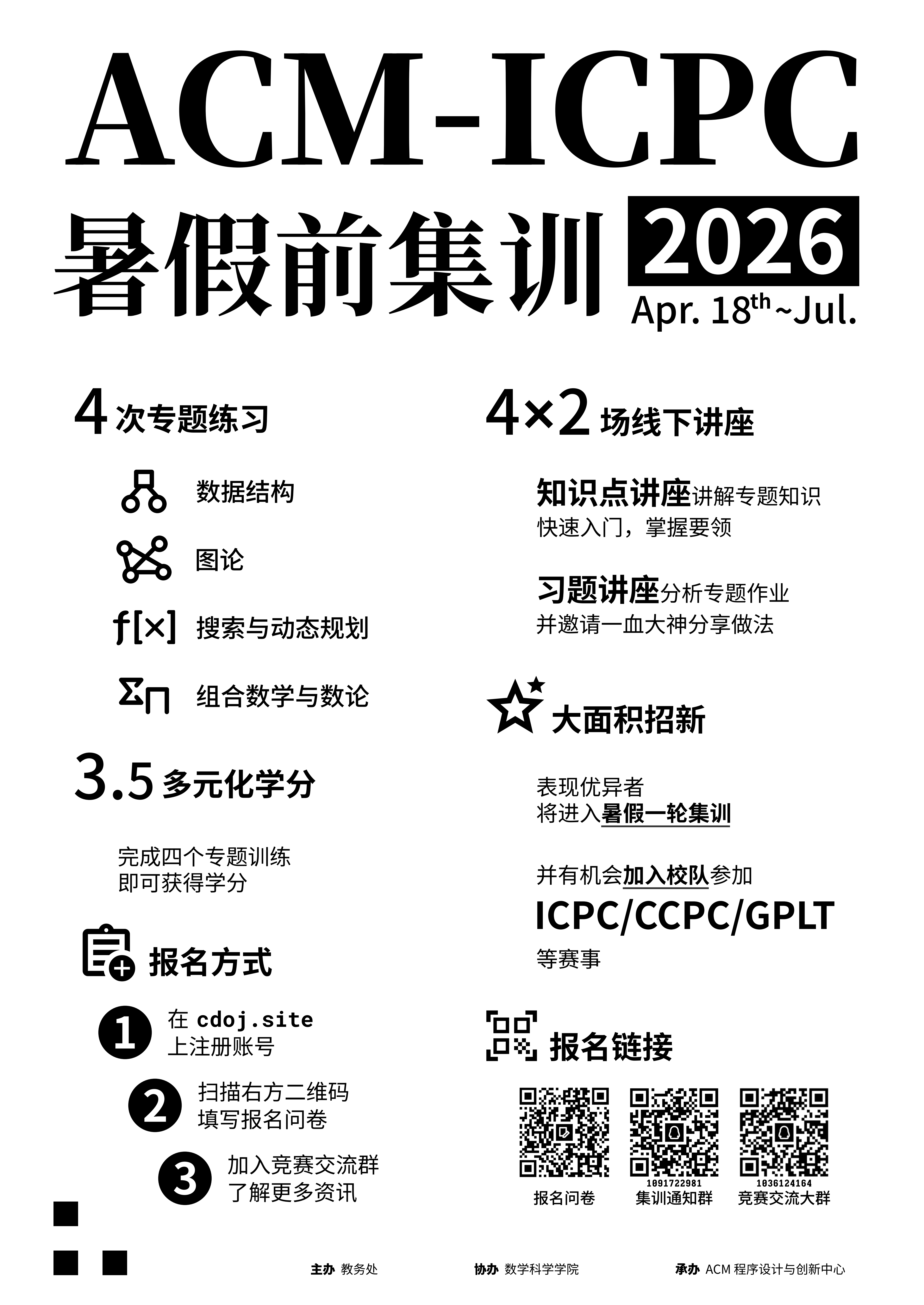 2026年暑假前集训将于4月18日开始每周六5-8节在清水河校区进行,暑假前集训将作为校队选拔的一部分,我们将通过暑假前集训选拔参加暑假一轮集训的同学,通过暑假前集训和一轮集训的同学将有机会代表学校参加之后的XCPC/GPLT等赛事。
